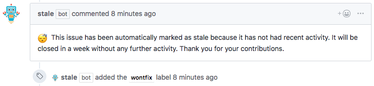 And that’s all — Stale bot will scan your issues and pull request, add a comment to the ones without recent activity, and then close them.